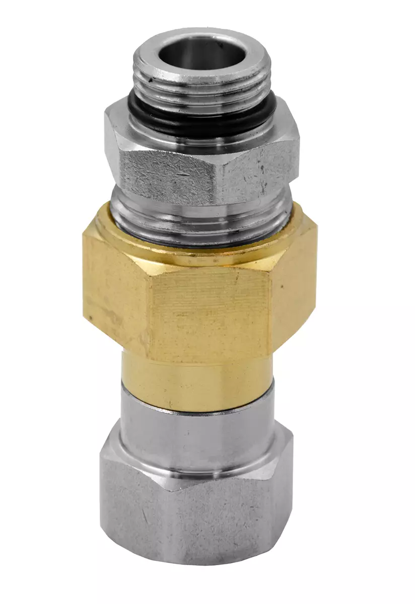 Metallinen pyörivä liitin Clen GX 146 ja GX 162 pesureihin. Pyörivä liitin estää paineletkun kietoutumisen helpottaen käyttöä.