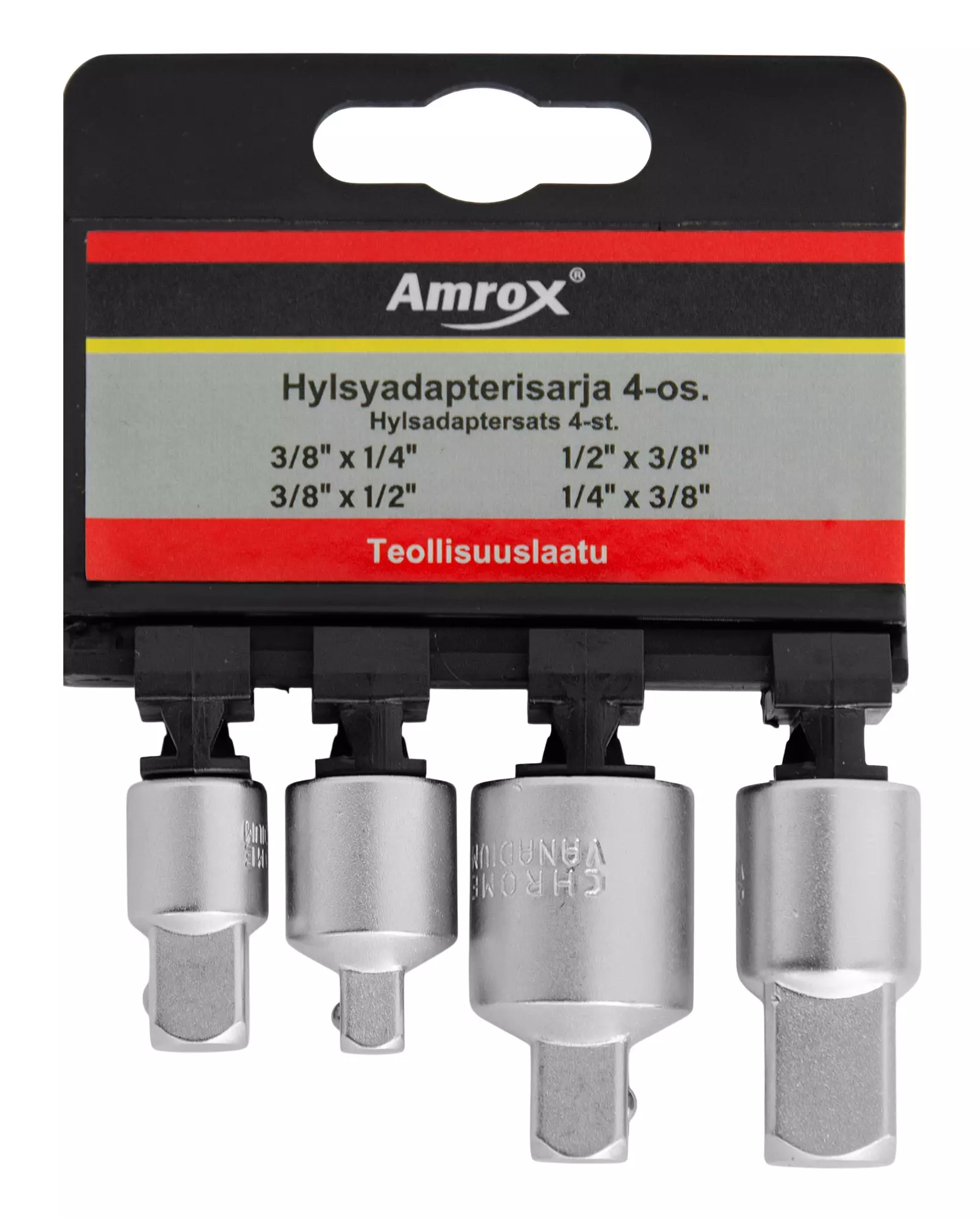 -materiaali kromi-vanadium-terästä, satiini viimeistely -sarjassa 4 kpl hylsyadaptereita, koot: --1 kpl 3/8" x 1/4" --1 kpl 3/8" x 1/2" --1 kpl 1/2" x 3/8" --1 kpl 1/4" x 3/8" -koko: naaras – uros... Lue lisää