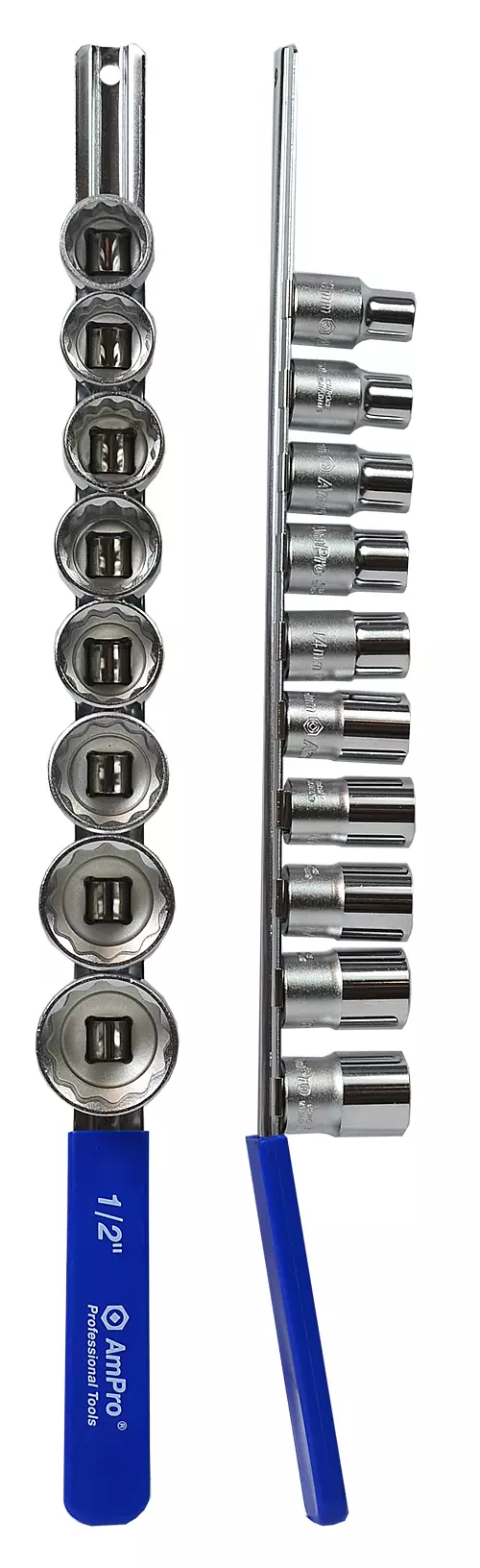 AmPro -kromi-vanadium -terästä -hylsyt kätevässä pitimessä, jossa tukeva muovikahva -sarja sisältää 18 kpl 1/2" 12PT hylsyä: --10, 11, 12, 13, 14, 15, 16, 17, 18, 19, 20, 21, 22, 23, 24, 27... Lue lisää