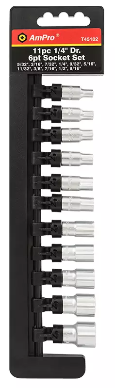 Amrox -materiaali kromi-vanadium- terästä -sarja sisältää 6PT hylsyjä: --5/32", 3/16", 7/32", 1/4", 9/32", 5/16", 11/32", 3/8", 7/16", 1/2", 9/16" -IP-ripustinpakkaus -ikuinen materiaalitakuu...