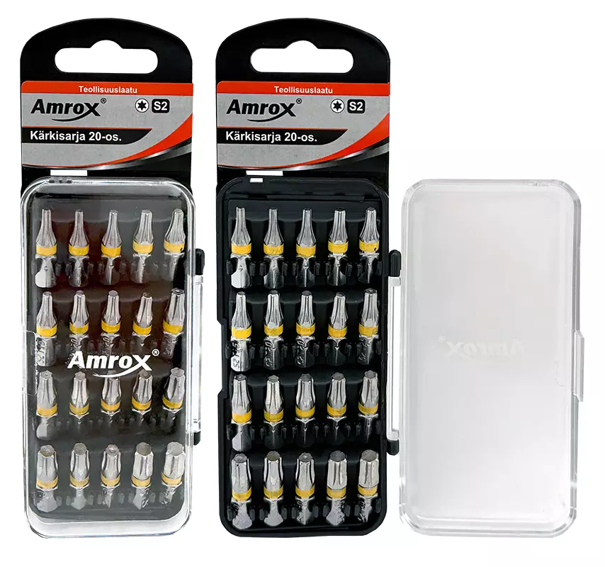Amrox -materiaali S2-seosteräs -20-osainen Torx-kärkisarja 1/4" sisältää --3 kpl T10 --3 kpl T15 --3 kpl T20 --3 kpl T25 --3 kpl T27 --3 kpl T30 --2 kpl T40 -värikoodatut, väri neonkeltainen... Lue lisää