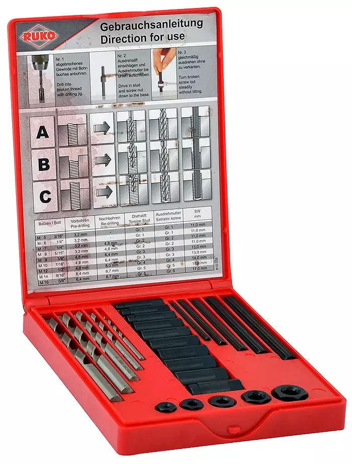 Ruko -ulosvetäjäsarja katkenneen ruuvin poistamiseen vaikeista paikoista -sarja sisältää: --5 kpl HSS poranteriä 3.2, 4.8, 6.4, 8, 8.6 mm --5 kpl vääntötappeja GR.1, 2, 3, 4, 5 --5 kpl... Lue lisää