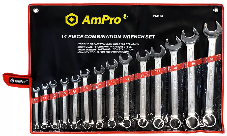 -14-osainen sarja sisältää seuraavat avaimet: 10, 11, 12, 13, 14, 16, 17, 19, 21, 22, 24, 27, 30, 32 mm