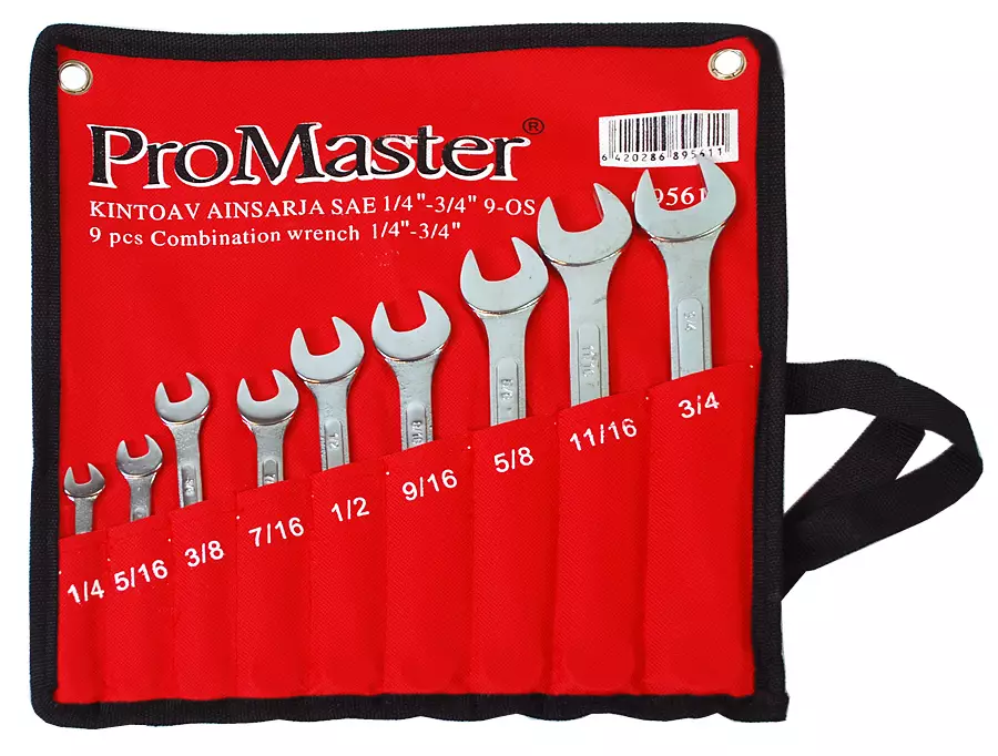 ProMaster -seosterästä -9-osainen sarja sisältää koot: --1/4", 5/16", 3/8", 7/16", 1/2", 9/16", 5/8", 11/16" ja 3/4" -kätevä käärittävä/ripustettava säilytyspussi -takuu 1 vuosi... Lue lisää