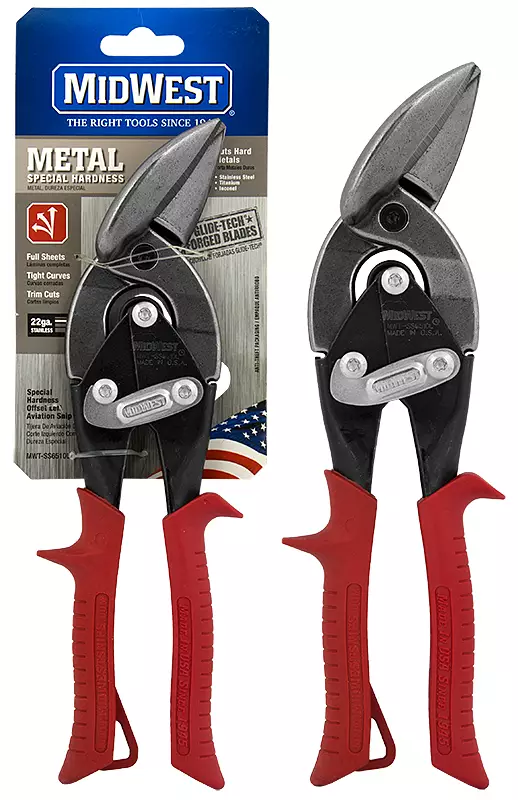 MIDWEST® Special Hardness Offset Left Cut levysaksissa on Rc60-lujuuteen lämpökäsitellyt terät, jotka leikkaavat ruostumatonta terästä,