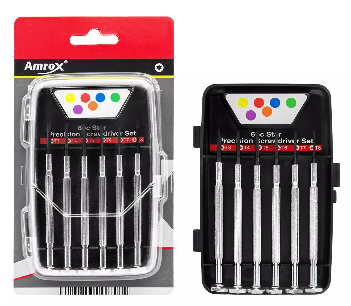 Amrox -sarja sisältää: --torx T3, T4, T5, T6, T7, T8 -terät karkaistua metalliseosta -IP-ripustinpakkaus -takuu 1 vuosi