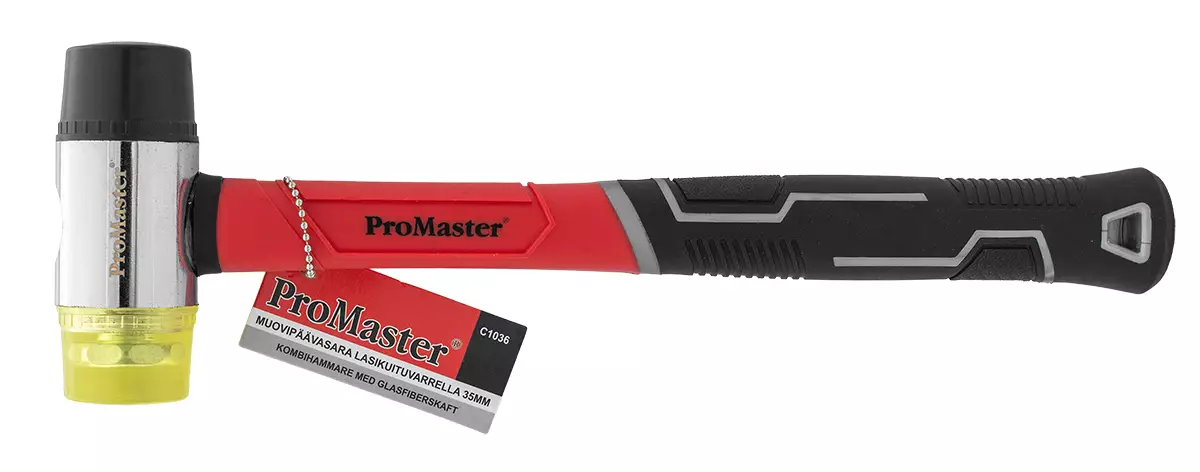 -varsi 65 % lasikuitua -lyöntipään halkaisija 35mm -urattu kumi-grip -kahva -viivakoodimerkintä -takuu 1 vuosi