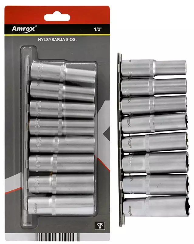 Amrox -korkealuokkaista kromi-vanadium-terästä -sarja sisältää 8 kpl 1/2" 6PT pitkiä hylsyjä --koot: 12, 13, 14, 15, 16, 17, 18, 19 mm -IP-ripustinkampa -ikuinen materiaalitakuu... Lue lisää