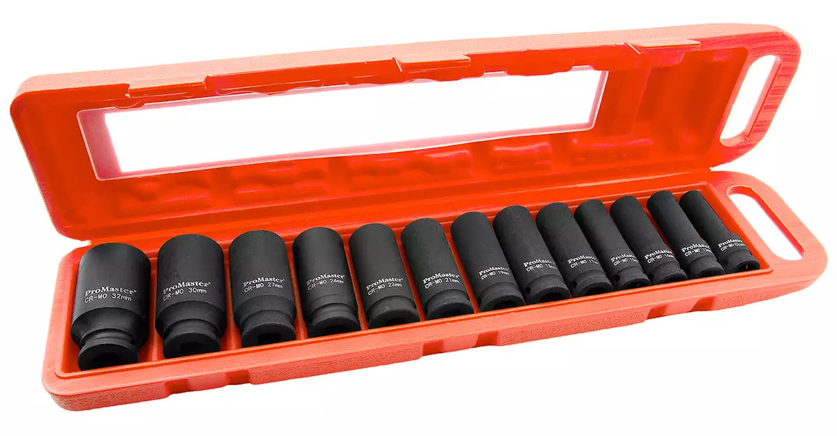 ProMaster -materiaali kromi-molybdeeni-terästä -sarja sisältää: 10, 13, 14, 15, 17, 18, 19, 21, 22, 24, 27, 30, 32mm hylsyt -pituus 78mm -muovirasia -takuu 1 vuosi