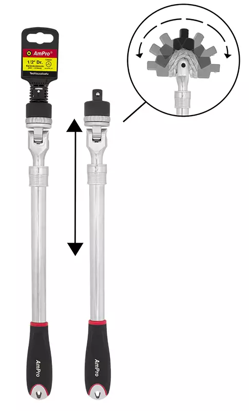 AmPro -materiaali kromi-vanadium -terästä -36-hampainen -pää kääntyy 180 astetta -teleskooppivarsi -kokonaispituus 457-610 mm -suunnanvalitsin -tukeva, ergonomisesti muotoiltu kädensija antaa... Lue lisää