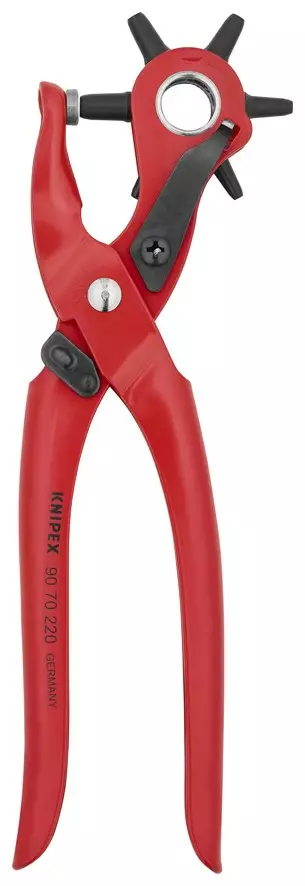 Revolverireikäpihdit punainen jauhepinnoitettu 220 mm -reikien stanssaamiseen nahkaan, tekstiileihin ja muoviin -kuusi vaihdettavaa reikämeistiä Ø 2,0 / 2,5 / 3,0 / 3,5 / 4,0 / 5,0 mm... Lue lisää