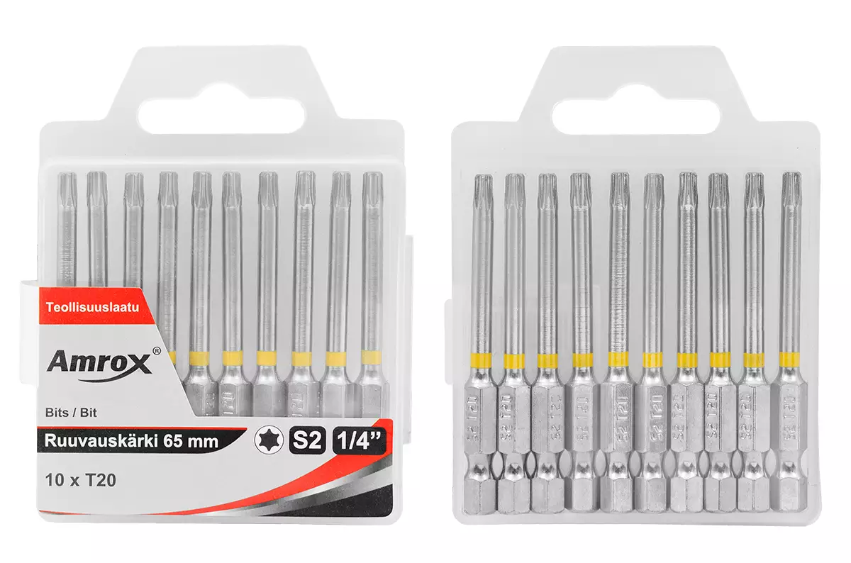 Amrox -materiaali S2-seosteräs -10-osainen sarjassa -1/4" kuusikulmainen kiinnitys -pituus 65 mm, chrome plated viimeistely -värikoodatut, väri neonkeltainen -IP-ripustinpakkaus -1 vuoden... Lue lisää