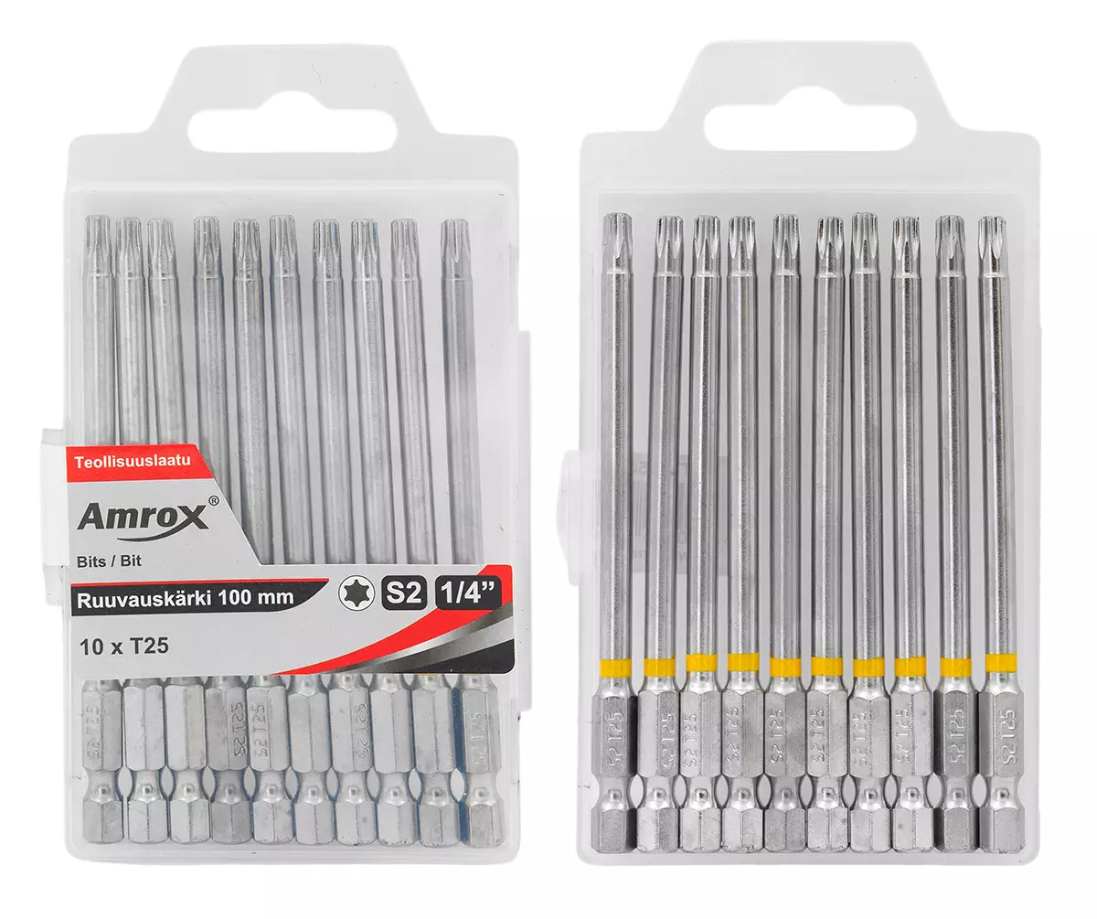 Amrox -materiaali S2-seosteräs -10-osainen sarjassa -1/4" kuusikulmainen kiinnitys -pituus 65 mm, chrome plated viimeistely -värikoodatut, väri neonkeltainen -IP-ripustinpakkaus -1 vuoden... Lue lisää