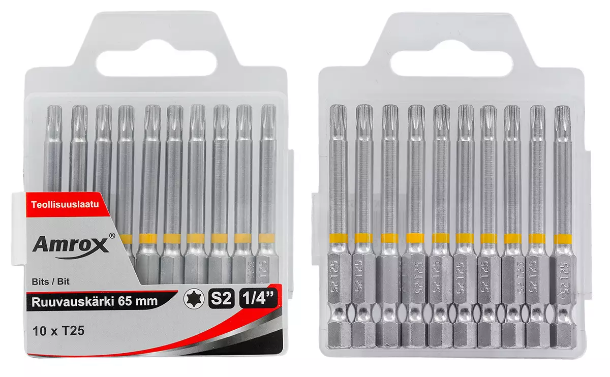 Amrox -materiaali S2-seosteräs -10-osainen sarjassa -1/4" kuusikulmainen kiinnitys -pituus 65 mm, chrome plated viimeistely -värikoodatut, väri neonkeltainen -IP-ripustinpakkaus -1 vuoden... Lue lisää