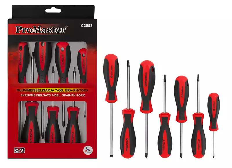 ProMaster -kromi-vanadium -terästä -7-osainen sarja sisältää seuraavat ruuvimeisselit: --2 kpl ura: 3x60mm, 5.5x125mm --2 kpl Phillips: PH1x80mm, PH2x100mm --3 kpl Torx: T15x80mm, T20x80mm... Lue lisää