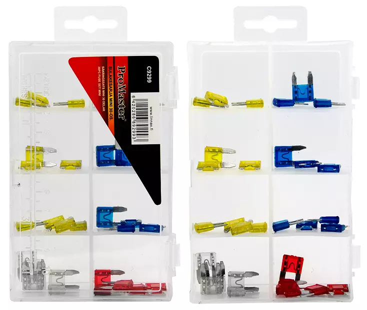 ProMaster -sarja sisältää seuraavat "Mini" -lattasulakkeet --5kpl x 10Amp --10kpl x 15Amp --10kpl x 20Amp --5kpl x 25Amp -IP-ripustinpakkaus/säilytysrasia -takuu 1 vuosi