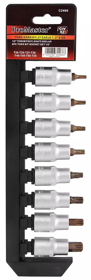 ProMaster -hylsyt kromi-vanadium -terästä -kärkien materiaali S2 -sarja sisältää koot T20, T25, T27, T30, T40, T45, T50, T55 -IP-ripustinkampa -takuu 1 vuosi