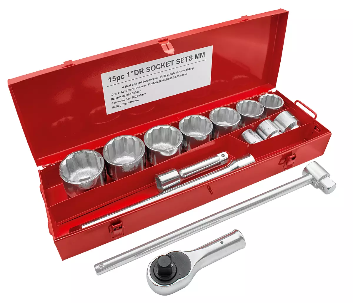 Amrox -kromi-vanadium -terästä -paino 27,5 kg -15-osainen -sarja sisältää: --10 kpl 1" 12PT hylsyjä: 36, 41, 46, 50, 55, 60, 65, 70, 75, 80 mm --1 kpl 1" räikkäväännin suunnanvaihdolla... Lue lisää
