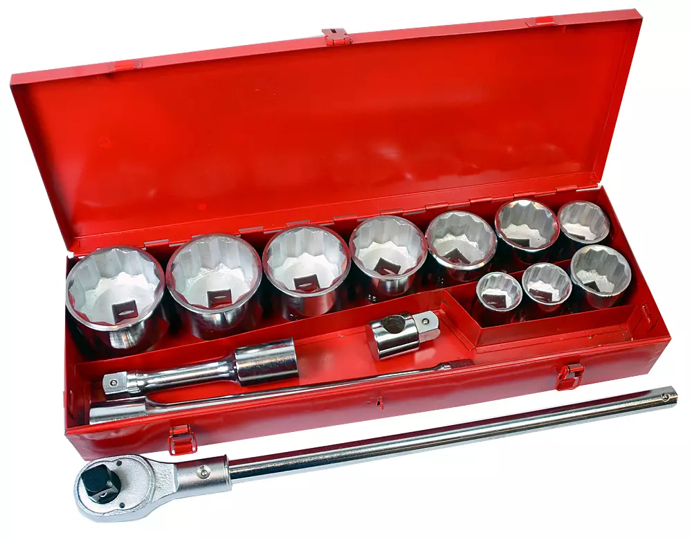 Amrox -kromi-vanadium -terästä -paino 27,5 kg -15-osainen -sarja sisältää: --10 kpl 1" 12PT hylsyjä: 36, 41, 46, 50, 55, 60, 65, 70, 75, 80 mm --1 kpl 1" räikkäväännin suunnanvaihdolla...