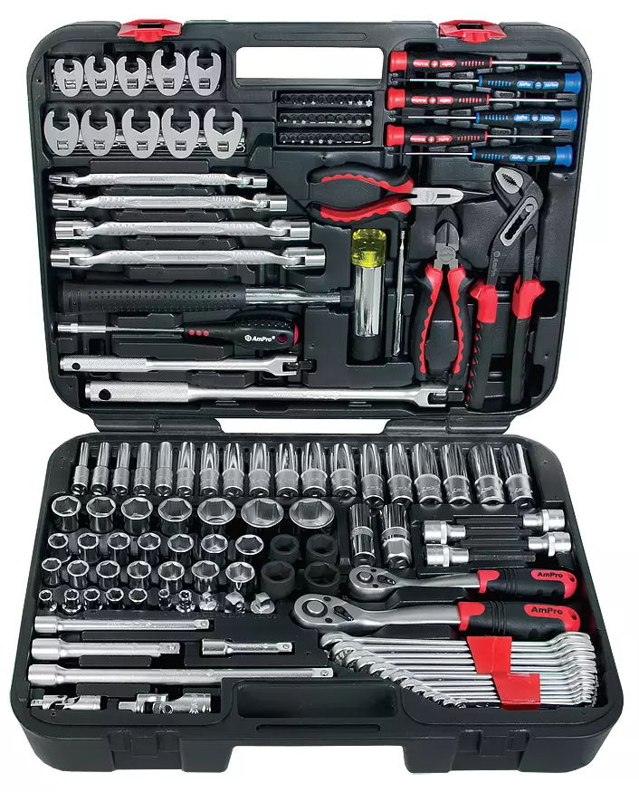 AmPro -kromi-vanadium -terästä -ulkomitat 13,0x39,5x50,0cm ja paino 14 kg -sarja sisältää: --12 kpl 3/8" 6PT hylsyjä, koot: 8-19 mm --12 kpl 3/8" 6PT pitkiä hylsyjä, koot: 8-19 mm --14 kpl... Lue lisää