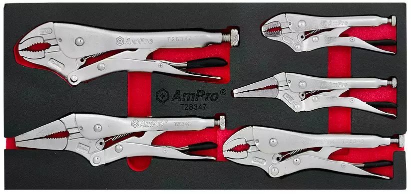 AmPro -sarja sisältää: --1 kpl pitkäleukaiset lukkopihdit 230mm --1 kpl lukkopihdit 250mm --1 kpl lukkopihdit 175mm --1 kpl pitkäleukaiset lukkopihdit 150mm --1 kpl lukkopihdit 125mm -foam... Lue lisää