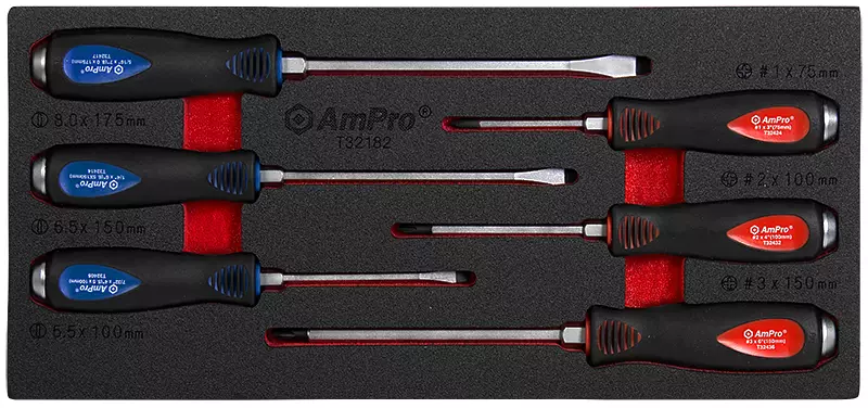 AmPro -materiaali kromi-molybdeeni-terästä -sarja sisältää: --3 kpl uraruuvi 5.5X100, 6.5X150, 8X175mm --3 kpl Phillips 1X75, 2X100, 3X150mm -uraruuvimeisselit DIN ISO 2380 mukaisia, PH-meisselit... Lue lisää