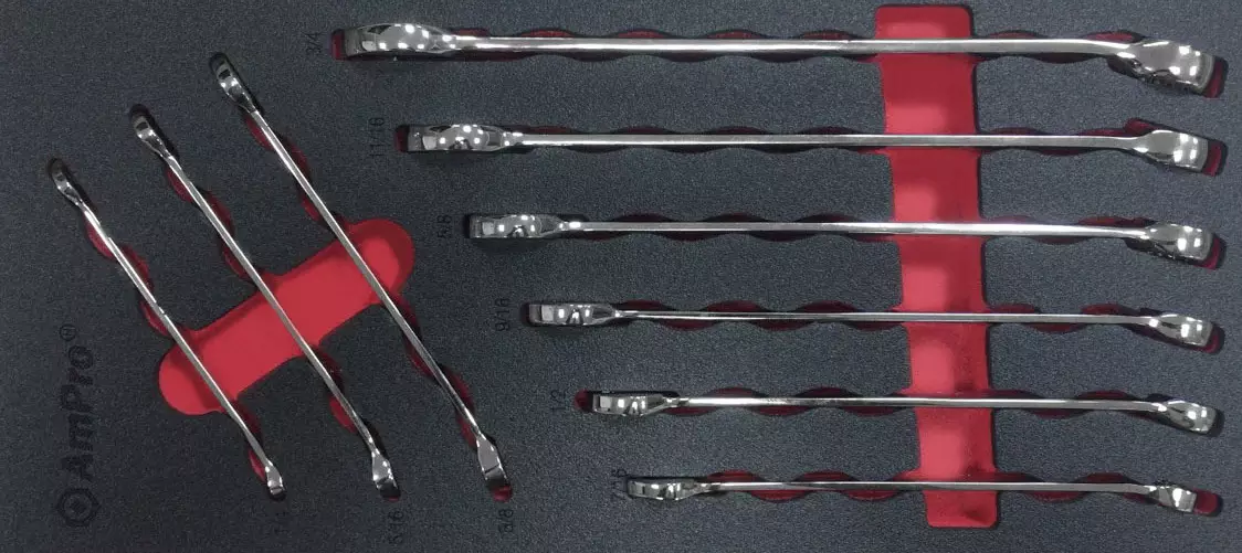 AmPro -materiaali kromi-vanadium -terästä -sarja sisältää: --kiintolenkkiavaimet 1/4", 5/16", 3/8", 7/16", 1/2", 9/16", 5/8", 11/16", 3/4" -foam säilytysalusta, koko 408 x 188 mm... Lue lisää