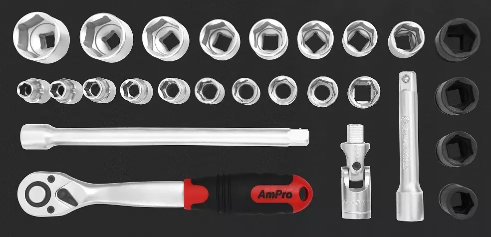 AmPro -materiaali kromi-vanadium -terästä -sarja sisältää: --18 kpl hylsyjä 10-24, 27, 30, 32 mm --4 kpl voimahylsyjä 17, 19, 21, 22 mm --1 kpl räikkäväännin --2 kpl jatkovarsia 125 mm ja... Lue lisää