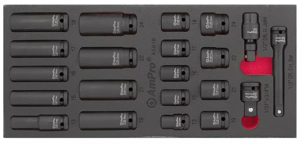 AmPro -materiaali kromi-molybdeeni -terästä -sarja sisältää: --9 kpl voimahylsyt 13, 15, 16, 17, 18, 19, 21, 22, 24 mm (A456x, A457x) --9 kpl pitkät voimahylsyt 13, 15, 16, 17, 18, 19, 21, 22... Lue lisää