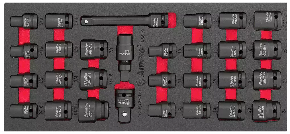 AmPro -materiaali kromi-molybdeeni -terästä -sarja sisältää: --15 kpl voimahylsyt 10-24 mm (A456x, A457x) --11 kpl voimahylsyt 3/8", 7/16", 1/2", 9/16", 5/8", 11/16", 3/4", 13/16", 7/8", 15/16"... Lue lisää