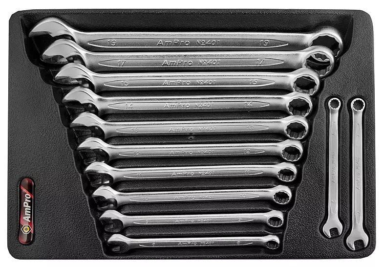 -12-osainen sarja sisältää seuraavat avaimet: 6, 7, 8, 9, 10, 11, 12, 13, 14, 15, 17, 19 mm