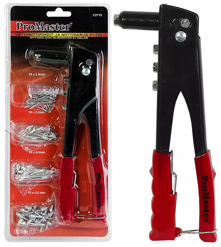 ProMaster -sarja sisältää --vetoniittipihdit 235 mm --vetoniitit 15x2.4mm, 15x3.2mm, 15x4.0mm, 15x4.8mm -mukana kärjen vaihtoavain ja 4 vaihtokärkeä, koot: 2.4, 3.2, 4.0 ja 4.8 mm -pihdeissä... Lue lisää