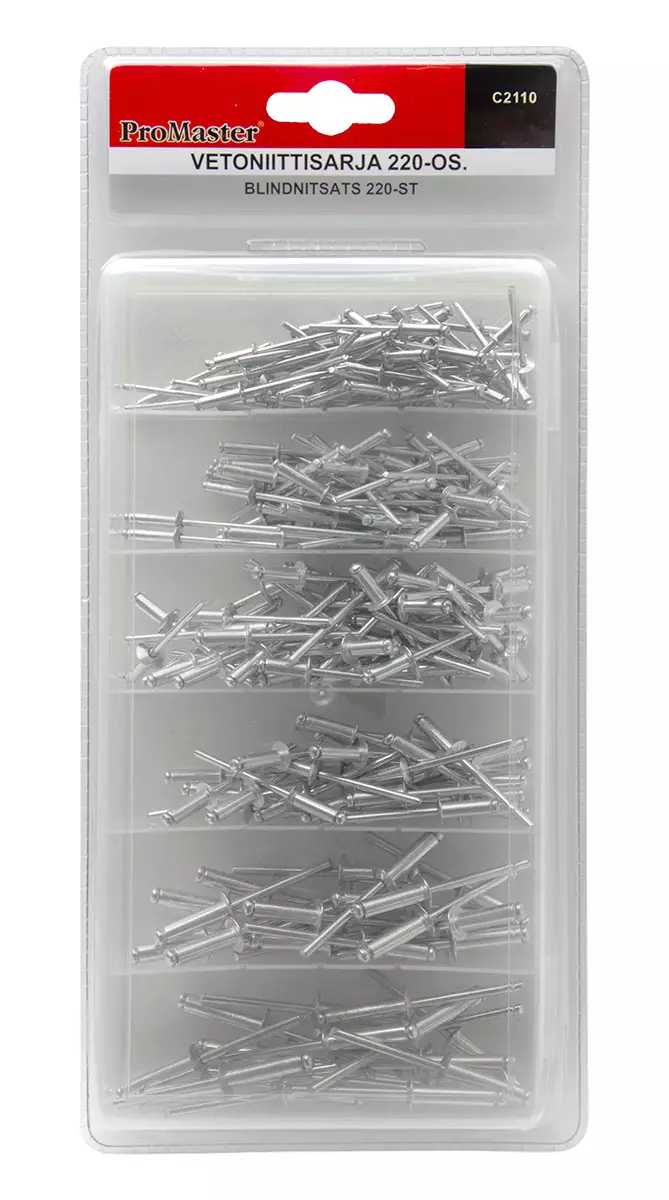 ProMaster -sarja sisältää 220 kpl vetoniittejä --50 kpl 3,2 x 10 mm --50 kpl 3,2 x 12 mm --50 kpl 4,0 x 10 mm --30 kpl 4,0 x 12 mm --20 kpl 4,8 x 16 mm --20 kpl 4,8 x 20 mm -IP-ripustinpakkaus... Lue lisää