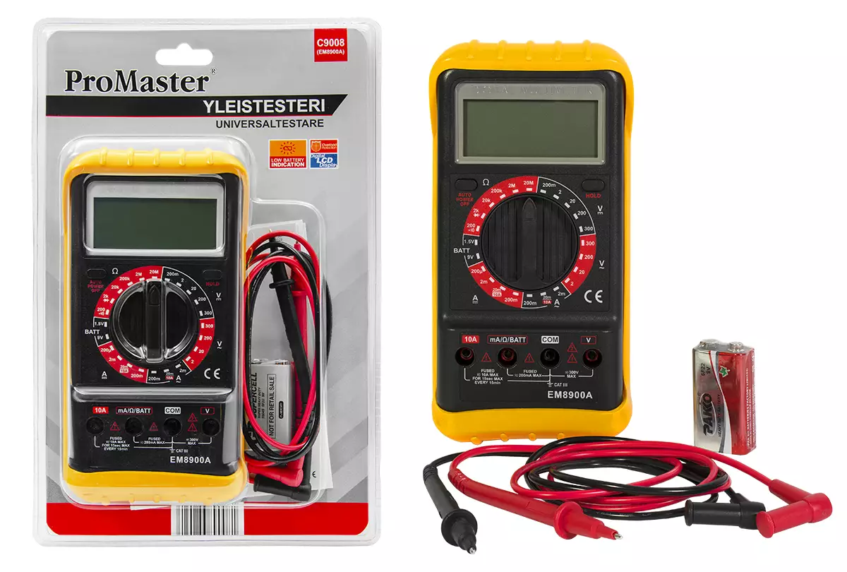ProMaster -3½ numeroinen LCD-näyttö -heikon pariston varoitusilmaisin -ylikuormitussuojattu -automaattinen sammutus -paristo 9V x 1 kpl sisältyy pakkaukseen -mitat 164 x 85 x 34mm ilman... Lue lisää