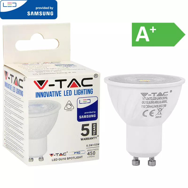 Huippulaadukkaalla Samsung-tekniikalla! -himmennettävä -rungon materiaali: muotoiltu muovi -polttimon koko: 50x55mm -LED tyyppi: SMD -kanta: GU10, muoto PAR16, Energialuokka: A+ -teho: 6,5W -teho... Lue lisää