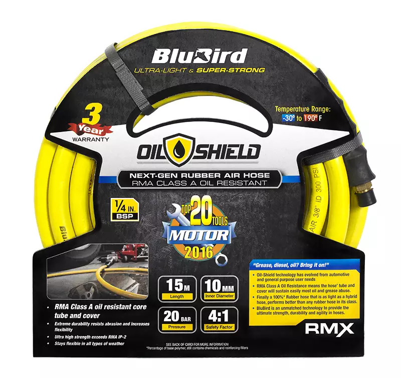 BluBird OilShield -premium-luokan kuminen paineilmaletku -40% kevyempi kuin yksikän vastaava A-luokan kumiletku -Motor Magazine 2016 USA, TOP20 tools -listalla -RMA Class A Oil Resistance, kestää... Lue lisää