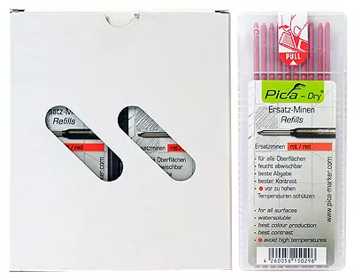 Pica -sisältää 10 kpl punaista varalyijyä -lyijyn halkaisija 2,8mm, pituus 125mm -merkintään kaikille pinnoille -vesiliukoinen -vältettävä korkeita lämpötiloja