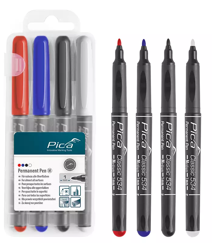 Pica -värit musta, sininen, punainen ja valkoinen -uudelleen suljettavassa muovilaatikossa -voidaan käyttää kaikille kiiltäville ja huokoisille pinnoille -viivan paksuus 1mm medium... Lue lisää