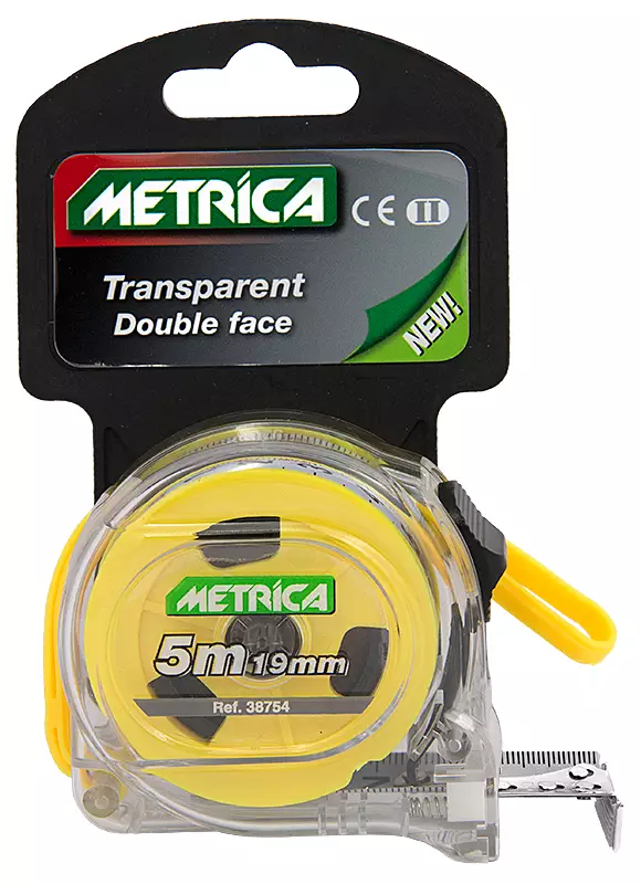 -rullamitta läpinäkyvässä kuoressa -nauhan pituus 5 m, leveys 19 mm -metrinen mitta-asteikko nauhan molemmilla puolilla -mattapintaisen nauhan väri valkoinen -erillinen jarru -EEC II ja CE... Lue lisää