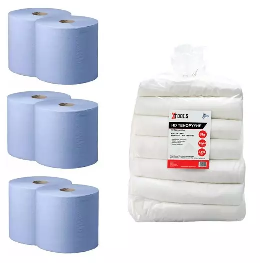 3 pakettia ( 6 rullaa) 2 kerros paperia 240 m/rulla + 1 paketti teholiina Wipes 5 kg ( noin 500 kpl)