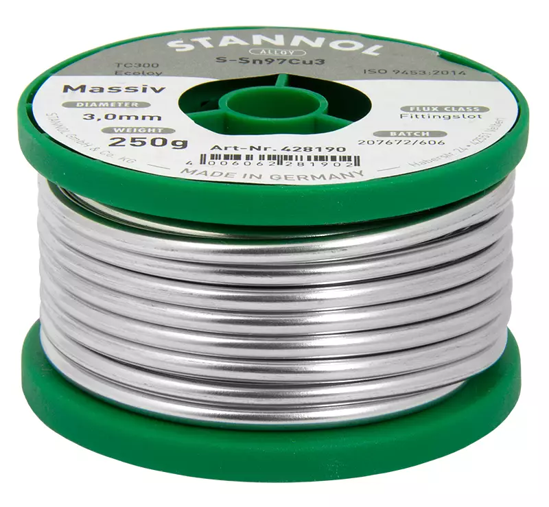 Stannol -Massiv -erityisesti putkijuotoksiin -materiaali: tina 97 %, kupari 3,0 % -tuote soveltuu seuraaville materiaaleille: kupari, messinki -sulamispiste 227-310 astetta... Lue lisää