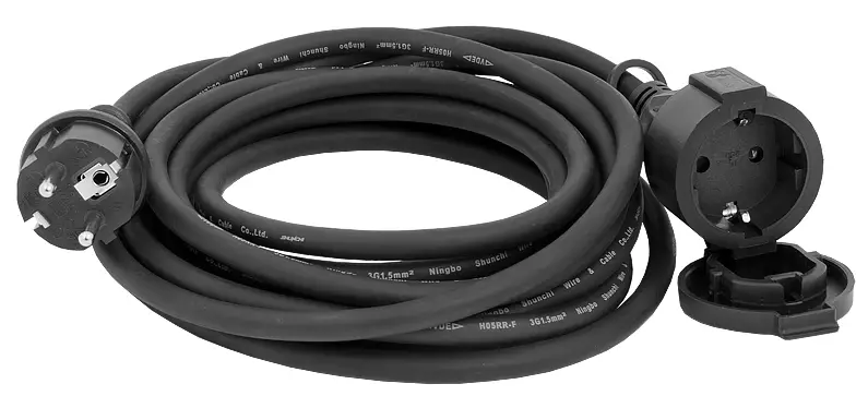 -1-osainen kumijatkojohto maadoitetulla pistokkeella ja pistorasialla