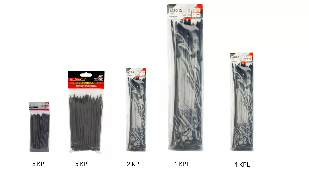 NIPPUSITEET PERUSVARASTO PAKETTI SISÄLTÄÄ: NIPPUSIDE 200MM 100KPL MUSTA 5 KPL NIPPUSIDE 300MM 100KPL MUSTA 5 KPL NIPPUSIDE 400MM 100KPL MUSTA 2 KPL NIPPUSIDE 9X700MM 50KPL MUSTA 1 KPL AVATTAVA... Lue lisää