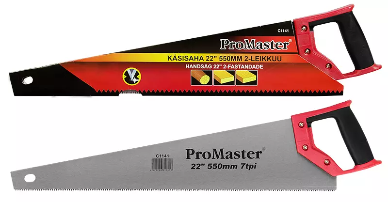 ProMaster -terän pituus 22" (550 mm) -kärkikarkaistut hampaat -7 hammasta / tuuma -2-leikkaavaa terää -teroitettava terä -terässä ripustusreikä -muovinen teräsuojus -grip -kahva -värillinen... Lue lisää