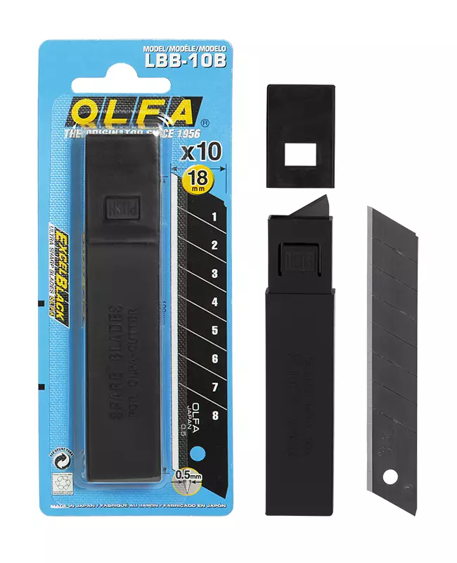 Olfa MADE IN JAPAN -musta erikoisterävä teräpakkaus -soveltuu 18 mm katkoteräveitsille -pakkaus sisältää 10 kpl teriä -muovikotelo terille -IP-ripustinpakkaus