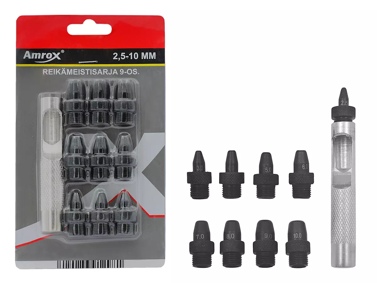 -reikien tekemiseen nahkaan, paperiin, muoviin, puulevyihin yms. pehmeisiin materiaaleihin -sarja sisältää: --1 kpl meisti --9 kpl vaihdettavaa päätä, koot: 2.5, 3, 4, 5, 6, 7, 8, 9, 10 mm... Lue lisää