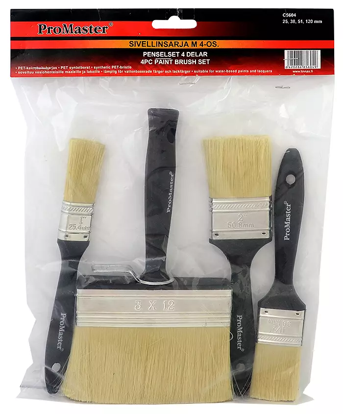 ProMaster sivellinsarja -Materiaali PET-keinokuituharjas -Soveltuu vesiohenteisille maaleille ja lakoille -Sarja sisältää koot 25mm, 38mm, 51mm ja 120mm siveltimet -IP-ripustinpussi -Takuu 1 vuosi... Lue lisää