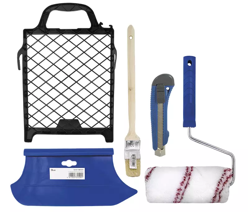 -Tapetointisarja sisältää liisteröintitelan,telaamisritilän, veitsen, liimasiveltimen ja tapetointilastan