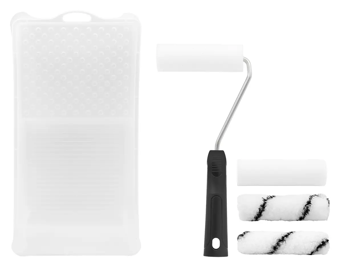 Color Expert -Yleiskäyttöön sisämaalauksessa -Setti sisältää: --2kpl vaahtomuovitelaa 100mm --2kpl mustaraitatelaa 100mm --varsi 290mm --maalikaukalo